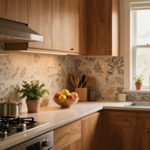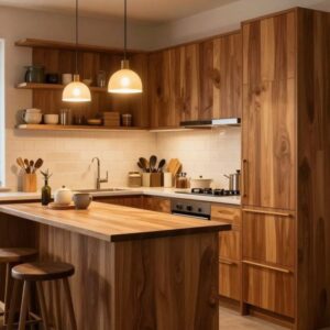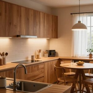 Small L-Shaped Modern Kitchen with Warm Wood & Soft Lighting