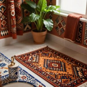 These elements are key to the comfort and style of a cozy ethnic bathroom, as they are natural, tactile, and traditional.