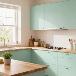 Pastels are a lovely way to warm white. Sage green, dusty blue or pale blush are nice choices because they’re pretty and don’t make the space feel too small. They add subtle dimension, creating a warm and inviting kitchen.