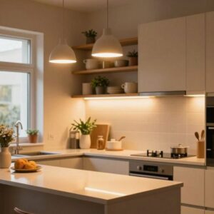 Pendant lights can help delineate your kitchen. It can lift your eyes, and expand the space. Select a pendant light that matches your kitchen style and offers soft lighting.