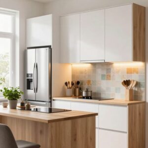 A continuous look makes rooms appear bigger. Matching wood laminate in the kitchen and living room is helpful. It creates a unified flow.
